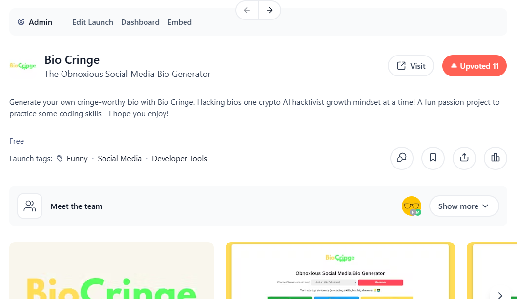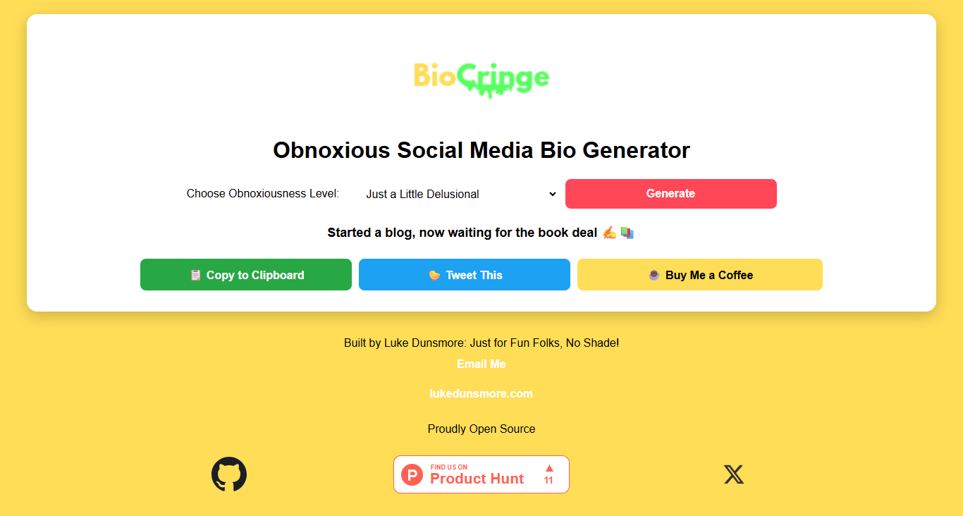 The project was built using modern web tooling—self-hosted infrastructure, clean front-end code, and a minimalist UI designed to keep the focus on the bios themselves (albeit with some obscene boldness of colour). Bio Cringe marked my first ever Product Hunt launch, earning attention for its blend of parody and practical design. Bio Cringe’s purpose as a demo tool is making tech that’s self-aware, user-empowering, and a bit mischievous.