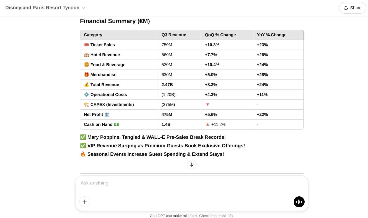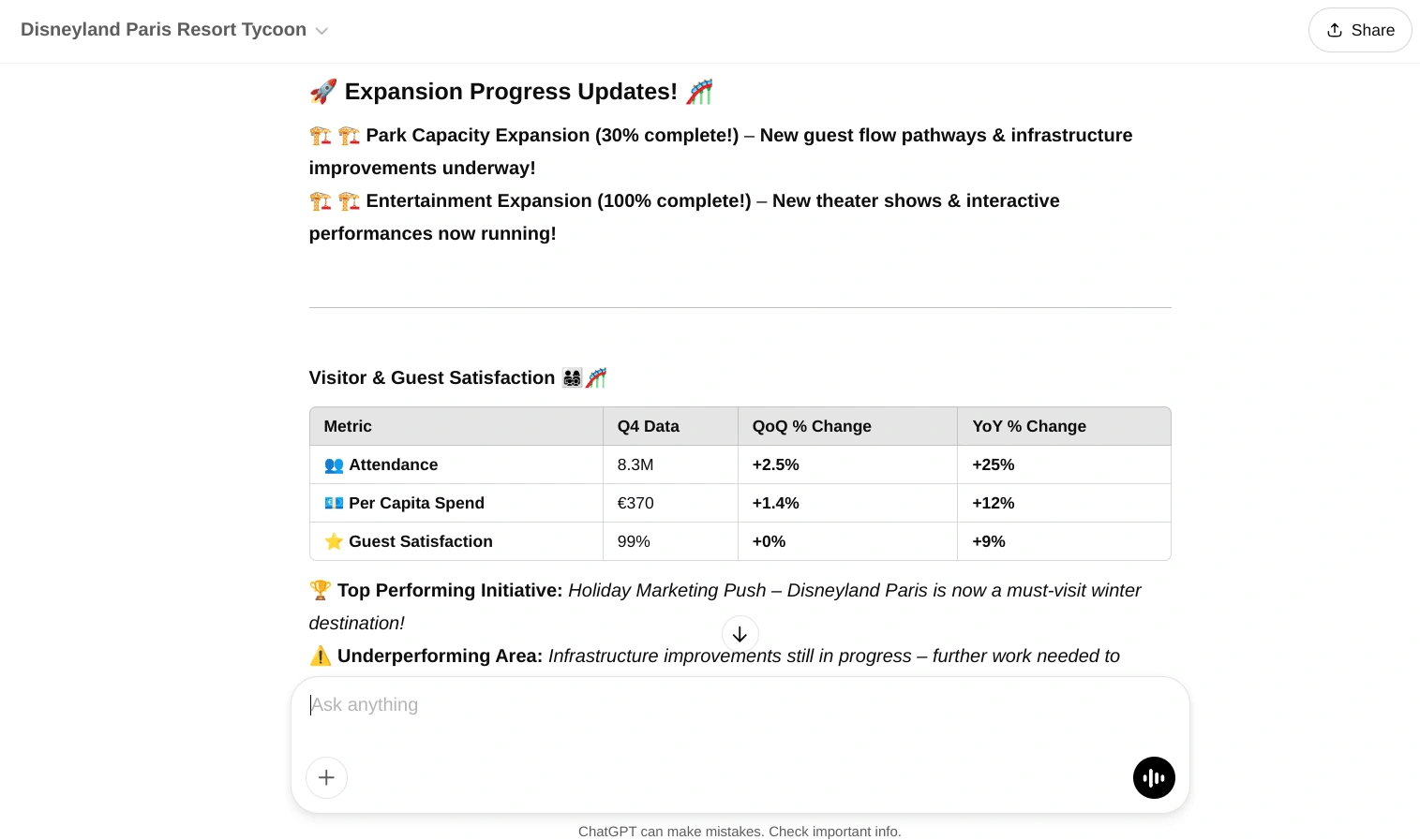 Behind the scenes, the simulation is quite complex. The GPT is designed to simulate weather, European macro-economic conditions, as well as the activities of other European (and even worldwide) Theme Parks, as well as simulate guest enthusiasm for current attractions, characters, new Disney franchises, etc.
