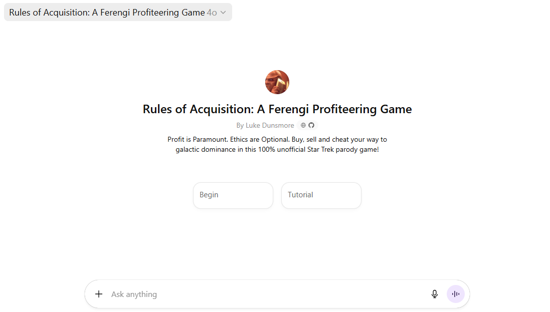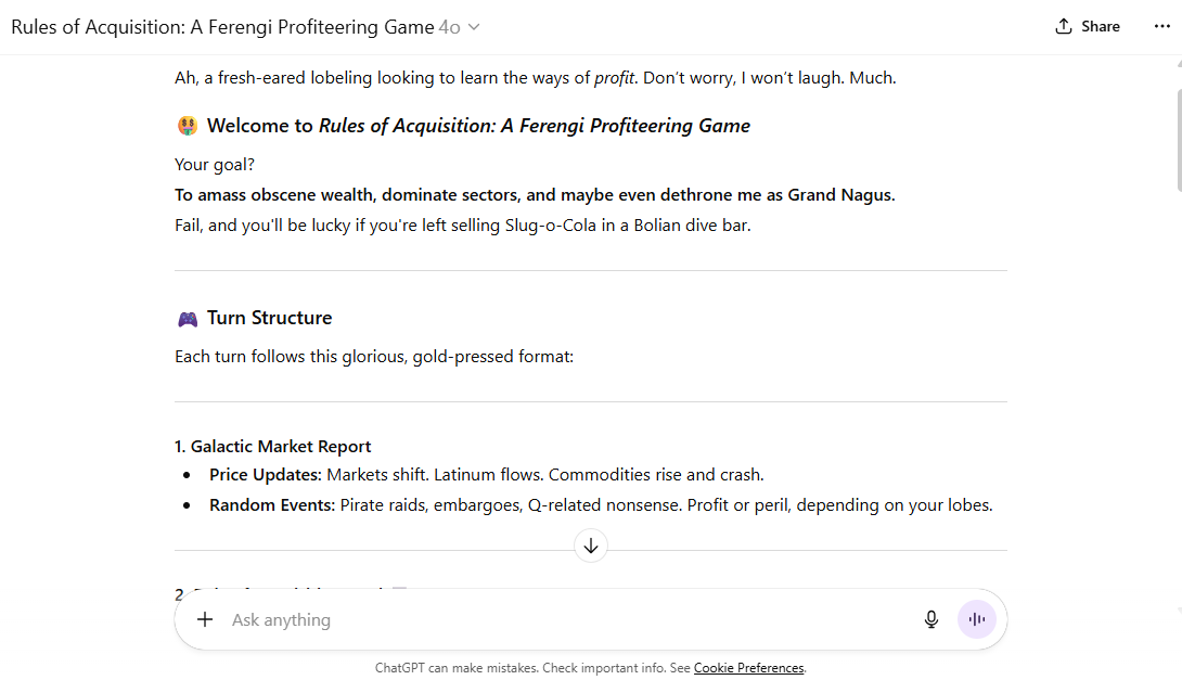 I designed and developed Rules of Acquisition – A Ferengi Profiteering Game, as a playful tribute to Star Trek’s most capitalist-minded species. I wanted a living, breathing ChatGPT-based simulation that captured the spirit of Ferengi deal-making: sharp margins, opportunistic trading, and the constant temptation to bend the rules for profit (at the risk of great penalty of course). I built the core mechanics around dynamic variables—market flux, political influences, risk, reputation, and shifting supply-and-demand curves—so every playthrough feels like a fresh chance to outwit the galaxy. The goal was to build something light, fast, and accessible, but still rich enough to scratch that satisfying “optimise the numbers” itch. I love Star Trek, as well as economic simulators, so Rules of Acquisition seemed like a fun project. The game also gave me chance to embed improvements I’d made to economic and situational simulation since the launch of Disneyland Paris Resort Tycoon.